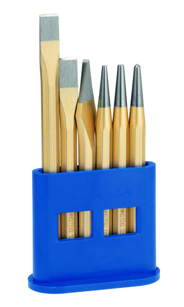Набор инструментов в пластиковом держателе, восьмигранное сечение, режущая кромка полированная, безопасная ударная головка, специальная инструментальная сталь, кованая, закалённая, окрашенная, содержимое: 2x зубило плоское, 1x крейцмейсель, 2x пробойник, 1x кернер. Сделано в Германии.