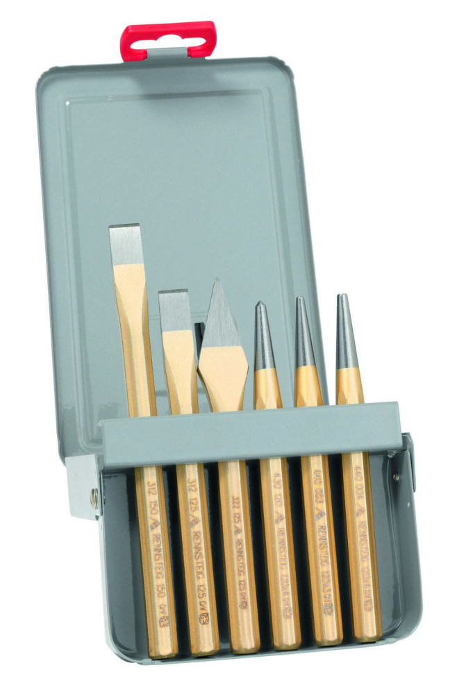 | Комплектация | 1 плоское зубило 150 мм (арт. 3121500); 1 плоское зубило 125 мм (арт. 3121250); 1 крейцмейсель 125 мм (арт. 3221250); 1 кернер Ø 4 мм (арт. 4301200); 1 пробойник Ø 3 мм (арт. 4400030); 1 пробойник Ø 4 мм (арт. 4400040) |