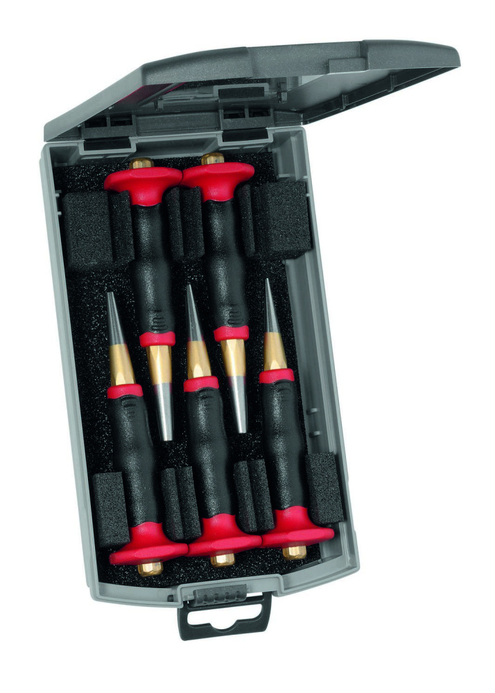 Набор выколоток пластиковая кассета, восьмигранные, полированная, безопасная ударная головка, специальная инструментальная сталь, закалённая, окрашенная, содержимое: размеры 3, 4, 5, 6, 8, 10 мм. Сделано в Германии.