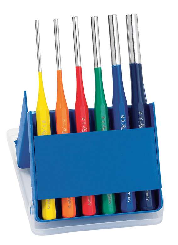 Набор выколоток, экслюзивное исполнение, пластиковая кассета, восьмигранные, глянцевая полировка, безопасная ударная головка, специальная инструментальная сталь, кованая, закалённая, покраска напылением, красный цвет, содержимое: размеры 3, 4, 5, 6, 8, 10 мм. Сделано в Германии.