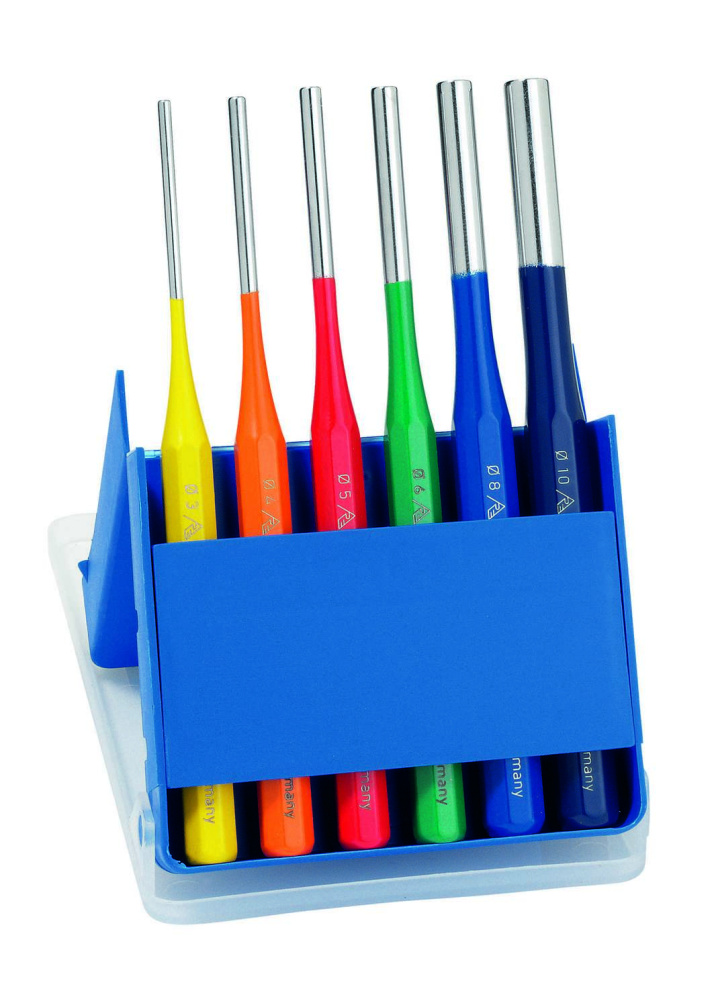 Набор выколоток, экслюзивное исполнение, пластиковая кассета, восьмигранные, глянцевая полировка, безопасная ударная головка, специальная инструментальная сталь, кованая, закалённая, покраска напылением, разные цвета, содержимое: размеры 3, 4, 5, 6, 8, 10 мм. Сделано в Германии.