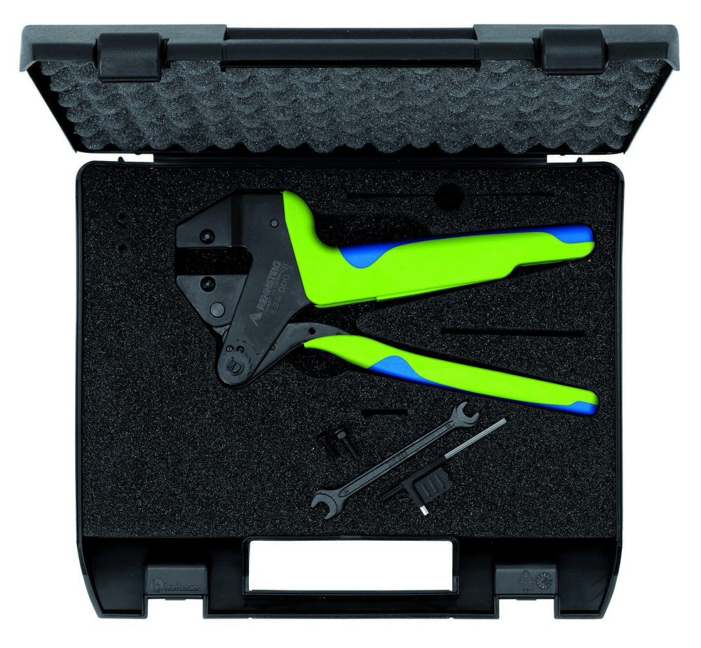 Набор Фотогальваника, для профессионального использования, базовая комплектация: многосистемные пресс-клещи PEW12, чемодан с набором Фотогальваника, место для многосистемных пресс-клещей PEW12, ножниц для кабеля D15, специального инструмента для удаления изоляции, 2 дополнительных опрессовочных плашек и 2 дополнительных приёмника контактов. Сделано в Германии.