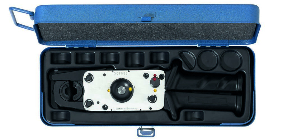 Механические ручные пресс-клещи, в металлическом чемодане, для опрессовки медных и алюминиевых проводников сечением 6-50 мм², откидная головка упрощает работу с соединителями сложной формы и смену плашек, сменные плашки, в пластиковом чемодане предусмотрены места под ещё шести плашек, без опрессовочных плашек. Сделано в Германии.