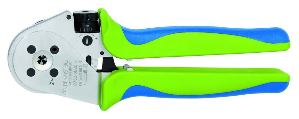 Тетрагональные пресс-клещи MicroCrimp, подходят для опрессовки точёных штыревых и втулочных наконечников, настройка параметров опрессовки с шагом 0,01 мм, контроль устанавливаемых параметров по шкале, проверка базовых установок с помощью калибра, надёжная опрессовка с помощью принудительной блокировки и синхронного движения обжимных губок, 230 мм, эргономичные и нескользящие 2К ручки, незначительное раскрытие ручек, запатентованные пресс-клещи, имеются разные приёмники для контактов, опрессовка 0,14-6,00 мм², AWG 26-10, макс. d контакта 7,5 мм. Сделано в Германии.