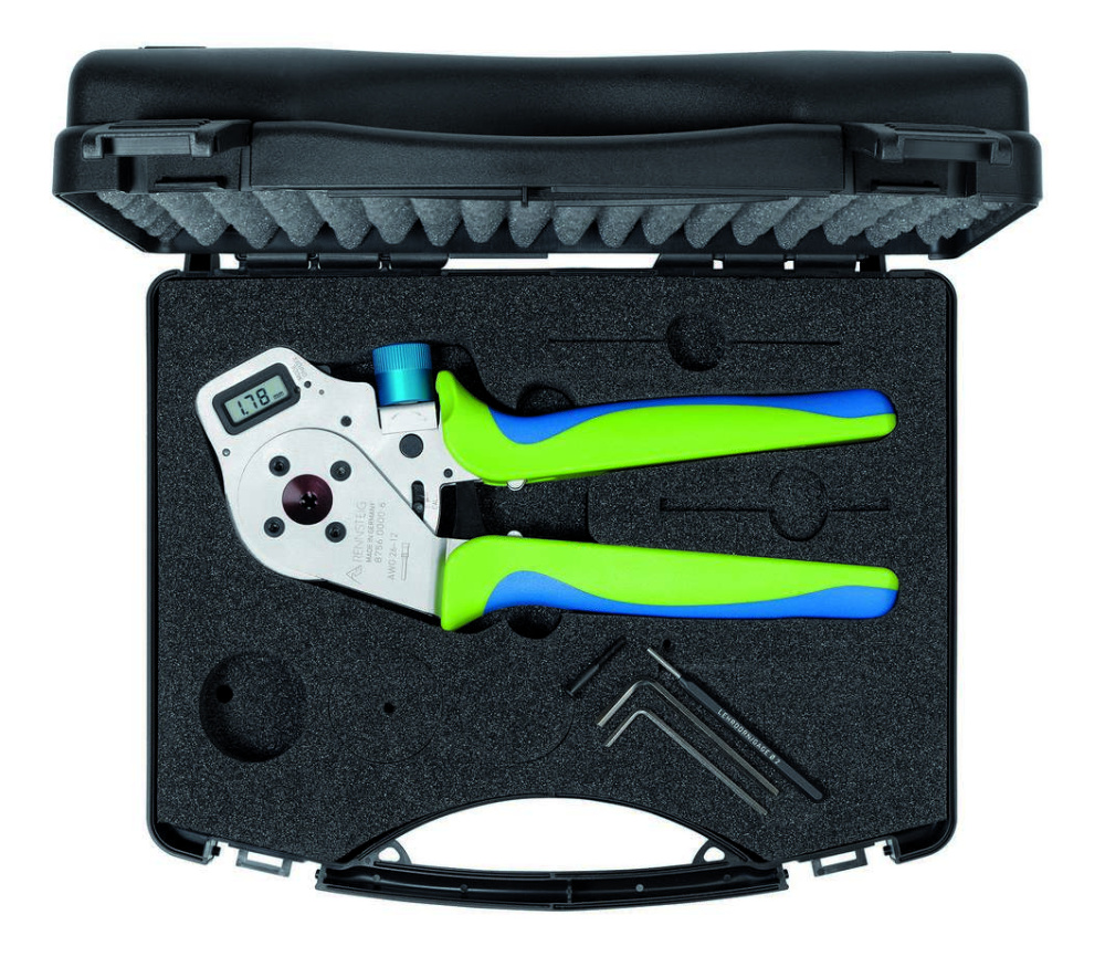 Тетрагональные пресс-клещи DigiCrimp, в пластиковом чемодане, подходят для опрессовки точёных штыревых и втулочных наконечников, настройка параметров опрессовки с шагом 0,01 мм, считывание данных на цифровом дисплее, проверка базовых установок с помощью калибра, возможность рекалибровки с помощью функции сброса настроек, электронная функция контроля износа с оповещением, надёжная опрессовка с помощью принудительной блокировки и синхронного движения обжимных губок, выбор нескольких функций настройки, длина 175 мм, эргономичные и нескользящие 2К ручки, незначительное раскрытие ручек, MIL-плашка, опрессовка 0,14-6,00 мм², AWG 26-10, аналог M22520/1-01. Сделано в Германии.