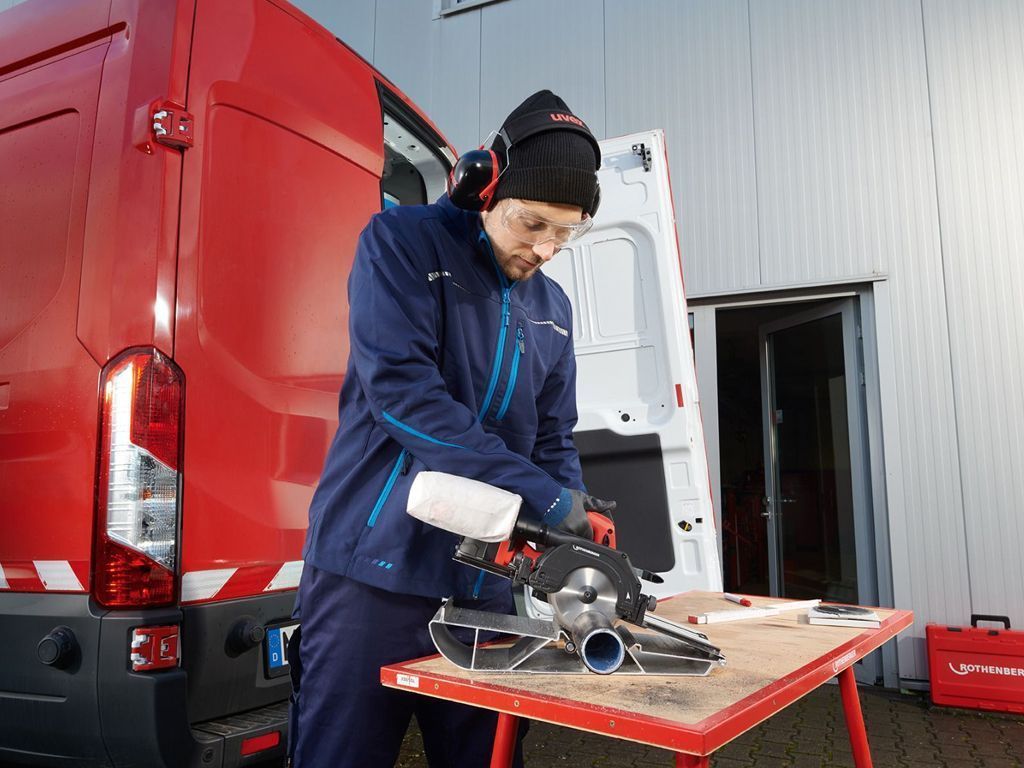 Электрический труборез PIPECUT mini D до 110 мм, пильный диск DURACUT Uni, с роликовой опорой, с ROCASE 6427, литиевый аккумулятор CAS 4,0 Ач/18 В и зарядное устройство ЕС.