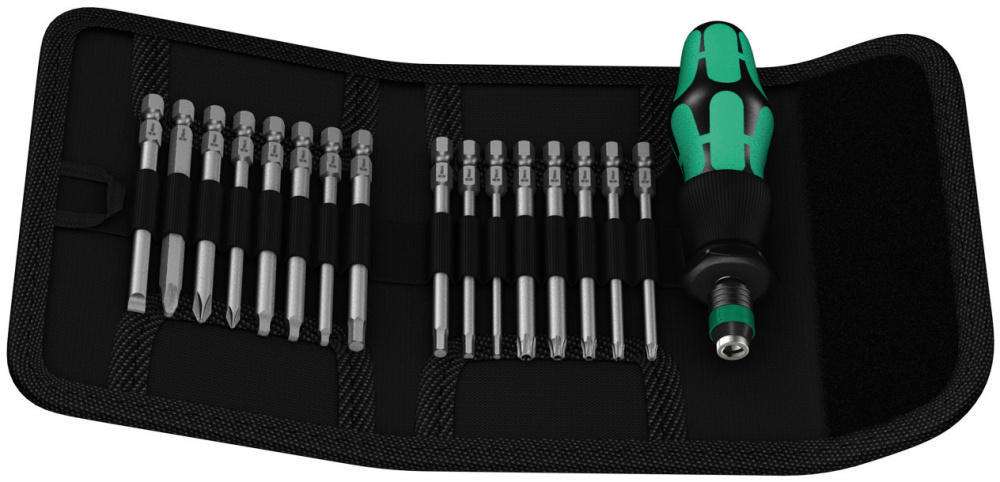 Складная сумка с битами длиной 89 мм. Ручка-держатель 816 R Kraftform с быстрозажимным патроном "Rapidaptor" и многокомпонентной ручкой Kraftform для малоутомительной работы. Kraftform Plus: твердые зоны ручки для высокой скорости работы, в то время как мягкие зоны ручки обеспечивают передачу больших моментов силы. Подходит для завинчивания в ручном и машинном режимах. 17 предметов.