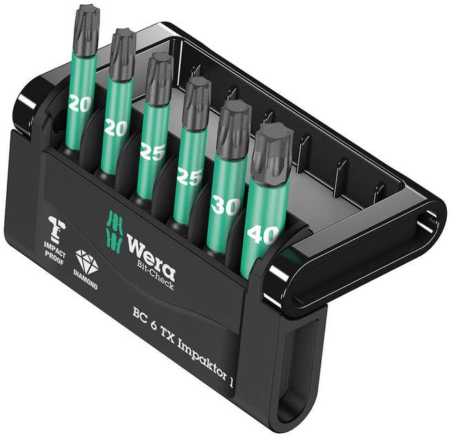 6 битов Wera Impaktor удобно и компактно размещены в практичном наборе Bit-Check. Благодаря наилучшему использованию свойств материала и оптимальному подбору геометрических параметров технология Impaktor обеспечивает изделиям срок службы, превышающий средние показатели даже с учетом жестких условий их применения. Наконечник бита покрыт мельчайшими алмазными частицами и за счёт сопротивления трением снижает выскальзывание из винта.