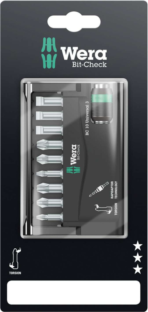 Набор в прочном футляре Bit-Check фирмы Wera. Наборы Bit-Check обеспечивают полный обзор всех размещённых инструментов. Лишние в работе биты просто возвращаются на свое место в футляре, чтобы не потерялись. Простая переноска, например, в кармане рубашки. Набор включает универсальный держатель с сильным постоянным магнитом и быстрозажимным патроном для битов с шестигранным хвостовиком 1/4" по стандарту DIN ISO 1173-C 6,3. Для установки в шуруповерт или патрон электродрели. Набор включает торсионные биты против быстрого износа. Закалённые до вязкой твёрдости биты Wera под внутренний шестигранник, для универсального применения.