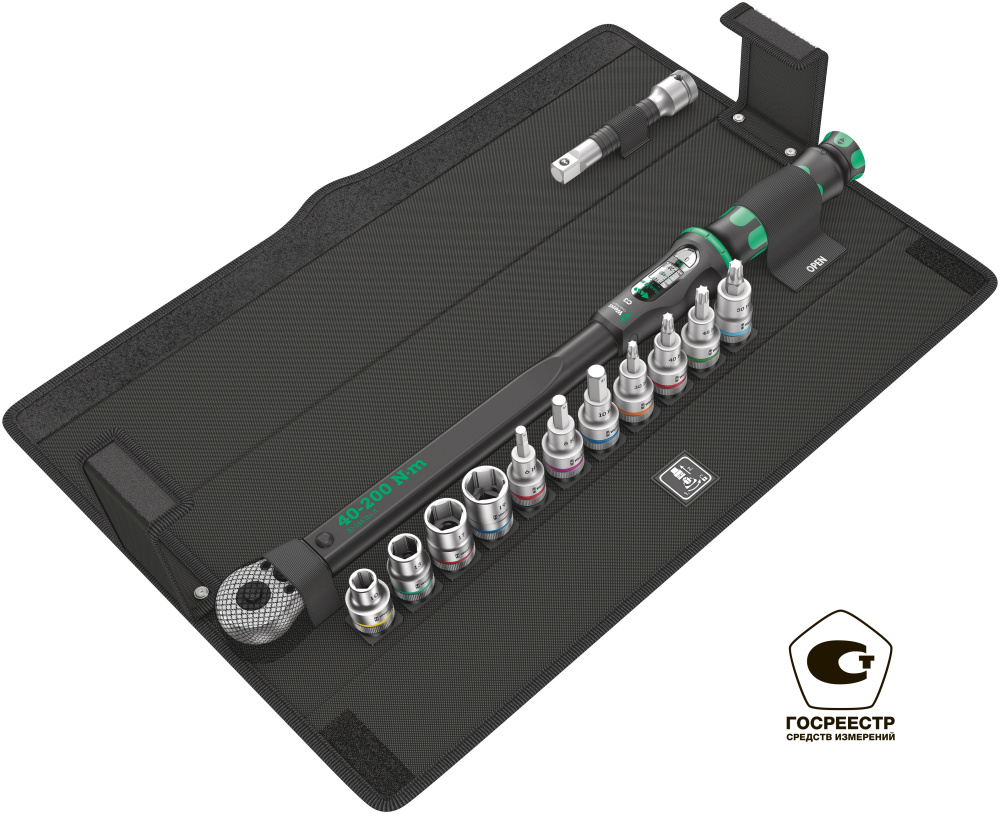 Набор с динамометрическим ключом Klick в неповторимом дизайне Wera. Добротная конструкция и высокая точность по стандарту DIN EN ISO 6789-1:2017-07. Простая установка и защита настроек. Отчётливо слышимое и ощущаемое пощёлкивание на каждом делении шкалы при прокручивании ручки дополнительно облегчает уверенный выбор требуемого значения. Надёжный механизм срабатывания обеспечивает отчётливо слышимый и ощущаемый щелчок-сигнал при достижении установленного момента затяжки. Для затяжки винтов с правой резьбой, с реверсной трещоткой на 45 зубцов. Динамометрический ключ и соответствующие принадлежности занимают мало места и размещены в прочном мягком футляре, который не повреждает рабочие поверхности. Набор включает: Click-Torque C 3, 1/2", 40 – 200 Нм, 4 головки с приводом 1/2", 7 отвёрточных головок Hex-Plus под внутренний шестигранник и TORX, удлинитель.
