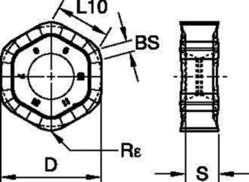 | SAP Material Number | ISO Catalog Number | [BS] Corner Facet Length | [Rε] Corner Radius | Average Chip Thickness [HM] | Cutting Edges per Insert | [S] Insert Thickness | [L10] Insert Cutting Edge Length | [D] Insert IC Size |