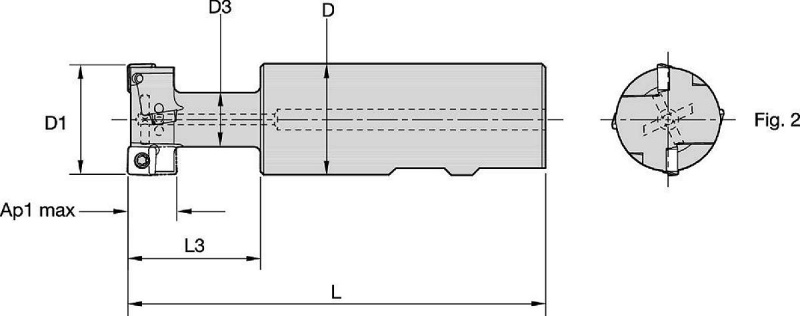 | SAP Material Number | ISO Catalog Number | Gage Insert | [D1] Effective Cutting Diameter | [L] Overall Length | Weight Pounds | [Z] Number of Flutes | Number of Inserts | [L1] Gage Length | [D] Adapter / Shank / Bore Diameter | [L3] Usable Length | [D3] Neck Diameter | [AP1MAX] 1st Maximum Cutting Depth |
