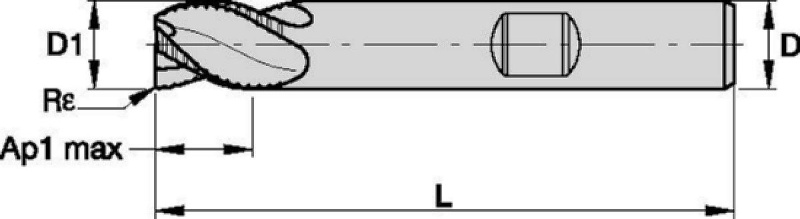 | SAP Material Number | ISO Catalog Number | [D1] Effective Cutting Diameter | [L] Overall Length | [D] Adapter / Shank / Bore Diameter | Adapter Style Machine Side | [AP1MAX] 1st Maximum Cutting Depth | [Z] Number of Flutes | [Re] Corner Radius |