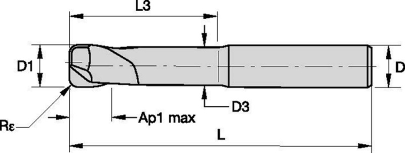| SAP Material Number | ISO Catalog Number | [D1] Effective Cutting Diameter | [L] Overall Length | [D] Adapter / Shank / Bore Diameter | Adapter Style Machine Side | [L3] Usable Length | [D3] Neck Diameter | [AP1MAX] 1st Maximum Cutting Depth | [Z] Number of Flutes | [Re] Corner Radius |
