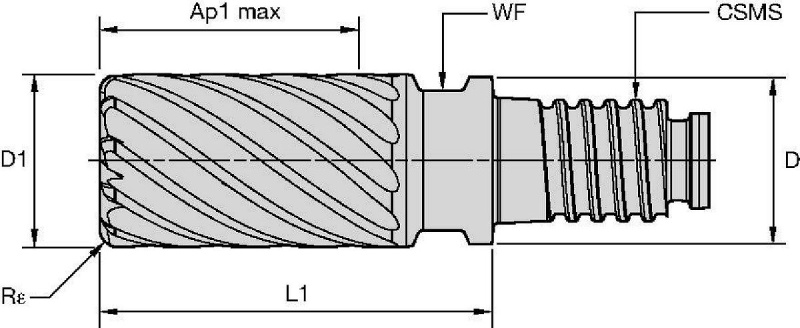 | SAP Material Number | ISO Catalog Number | [D] Adapter / Shank / Bore Diameter | [D1] Effective Cutting Diameter | Adapter Style Machine Side | [L1] Gage Length | [AP1MAX] 1st Maximum Cutting Depth | [CSMS] System Size Machine Side | [Z] Number of Flutes | [Re] Corner Radius | [WF] Width of Flat |