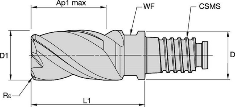 | SAP Material Number | ISO Catalog Number | [D1] Effective Cutting Diameter | [D] Adapter / Shank / Bore Diameter | Adapter Style Machine Side | [L1] Gage Length | [AP1MAX] 1st Maximum Cutting Depth | [CSMS] System Size Machine Side | [Z] Number of Flutes | [Re] Corner Radius | [WF] Width of Flat |