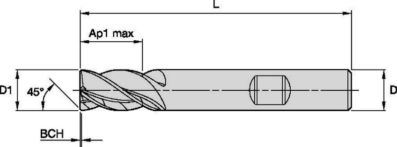 | SAP Material Number | ISO Catalog Number | [D1] Effective Cutting Diameter | [L] Overall Length | [D] Adapter / Shank / Bore Diameter | [BCH] Corner Chamfer Width | Adapter Style Machine Side | [L3] Usable Length | [AP1MAX] 1st Maximum Cutting Depth | [Z] Number of Flutes |