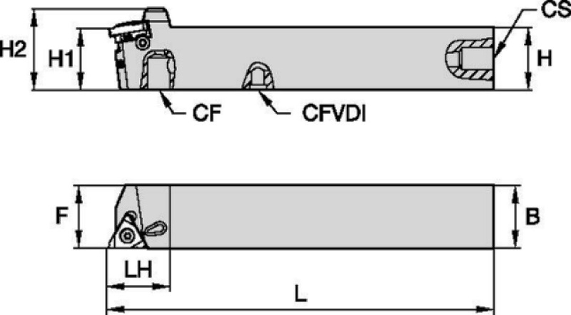 | SAP Material Number | ISO Catalog Number | [H] Shank Height | [H1] Cutting Height | [H2] Head Height | Gage Insert | COOL_SIZE_VDI | [LH] Head Length | [F] F Dimension | [CS] Coolant Supply Size | [L] Overall Length | [B] Shank Width |